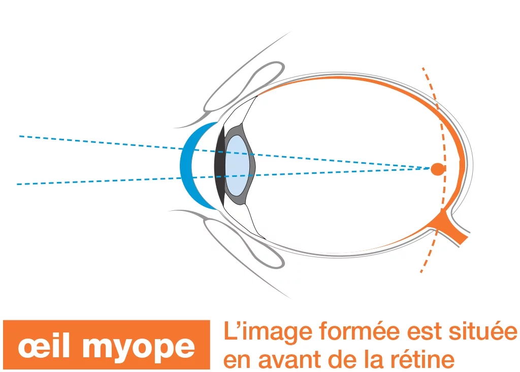 La myopie est un trouble de la vue qui rend difficile de voir clairement les objets éloignés. Cela se produit lorsque l’œil est trop long par rapport à la courbure de la cornée, ou lorsque la cornée est trop courbée. En conséquence, les images se forment devant la rétine au lieu d’y être focalisées correctement.